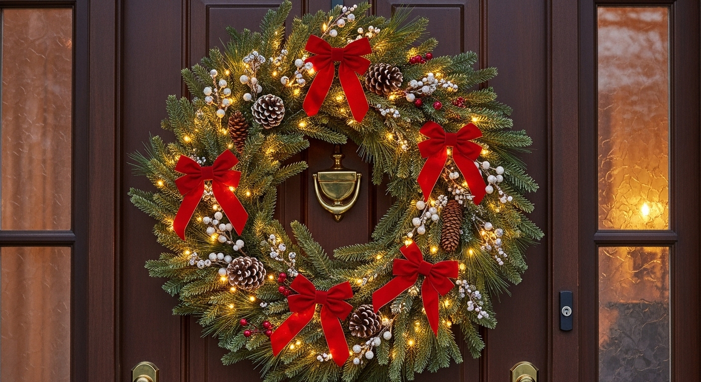 • Decorations: The wreath is often pre-decorated with classic holiday elements: